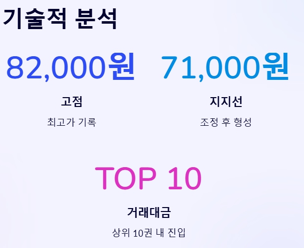 유일로보틱스의 주가는 한때 82,000원을 돌파하며 고점을 찍었고, 이후 조정을 거치면서도 강한 매수세와 거래 대금 집중으로 다시 반등을 노리고 있습니다.